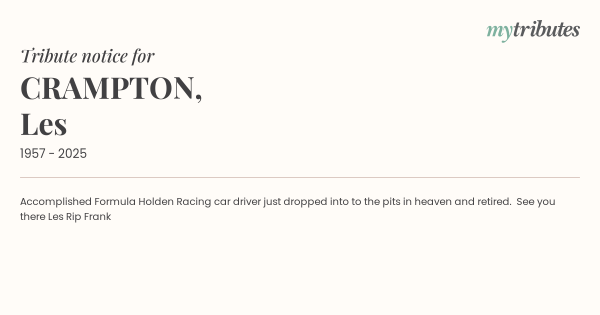 23°CAccomplished Formula Holden Racing car driver just dropped into to the pits in heaven and retired. See you there Les Rip Frank