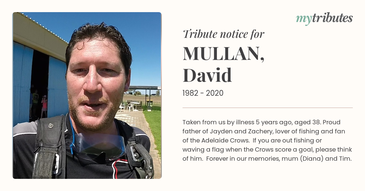 23°CTaken from us by illness 5 years ago, aged 38. Proud father of Jayden and Zachery, lover of fishing and fan of the Adelaide Crows. If you are out fishing or waving a flag when the Crows score a goal, please think of him. Forever in our memories, mum (Diana) and Tim.