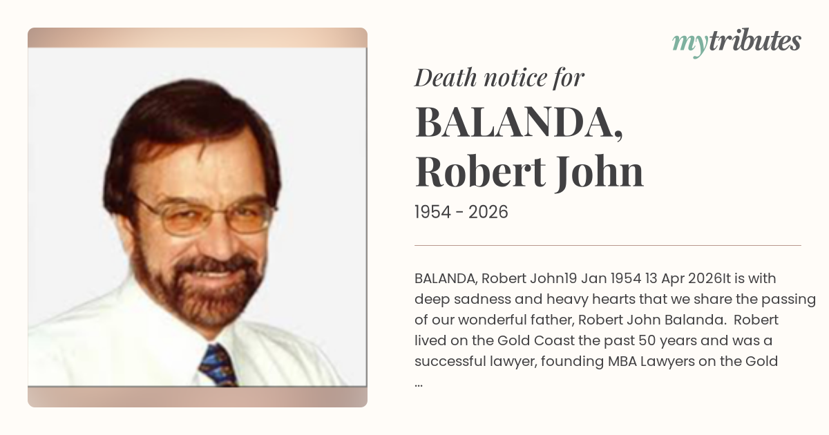 It is with deep sadness and heavy hearts that we share the passing of our wonderful father, Robert John Balanda. Robert lived on the Gold Coast the past 50 years and was a successful lawyer, founding MBA Lawyers on the Gold Coast. He left us peacefully, surrounded by love, and will be forever cherished and missed beyond words. Our father meant so much to so many, and we take comfort in knowing how loved he was by all who knew him.