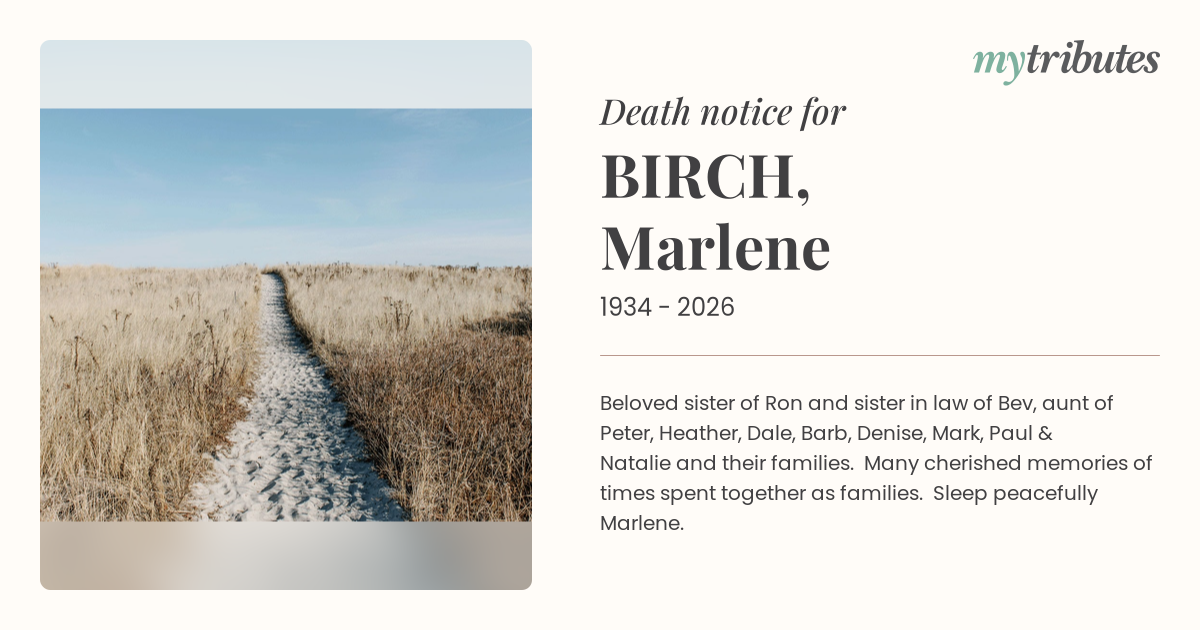 23°CBeloved sister of Ron and sister in law of Bev, aunt of Peter, Heather, Dale, Barb, Denise, Mark, Paul & Natalie and their families. Many cherished memories of times spent together as families. Sleep peacefully Marlene.