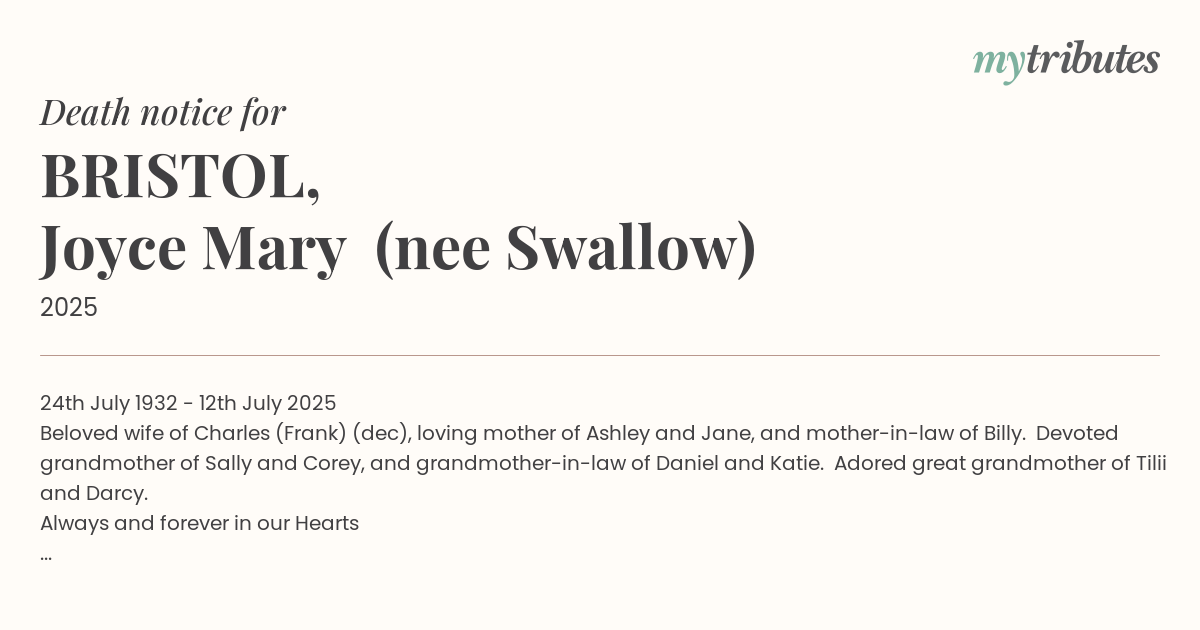 Beloved wife of Charles (Frank) (dec), loving mother of Ashley and Jane, and mother-in-law of Billy. Devoted grandmother of Sally and Corey, and grandmother-in-law of Daniel and Katie. Adored great grandmother of Tilii and Darcy.