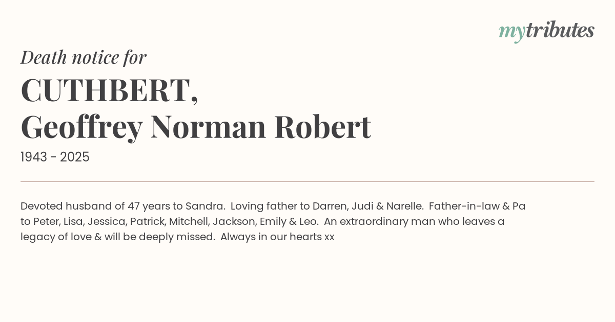 23°CDevoted husband of 47 years to Sandra. Loving father to Darren, Judi & Narelle. Father-in-law & Pa to Peter, Lisa, Jessica, Patrick, Mitchell, Jackson, Emily & Leo. An extraordinary man who leaves a legacy of love & will be deeply missed. Always in our hearts xx