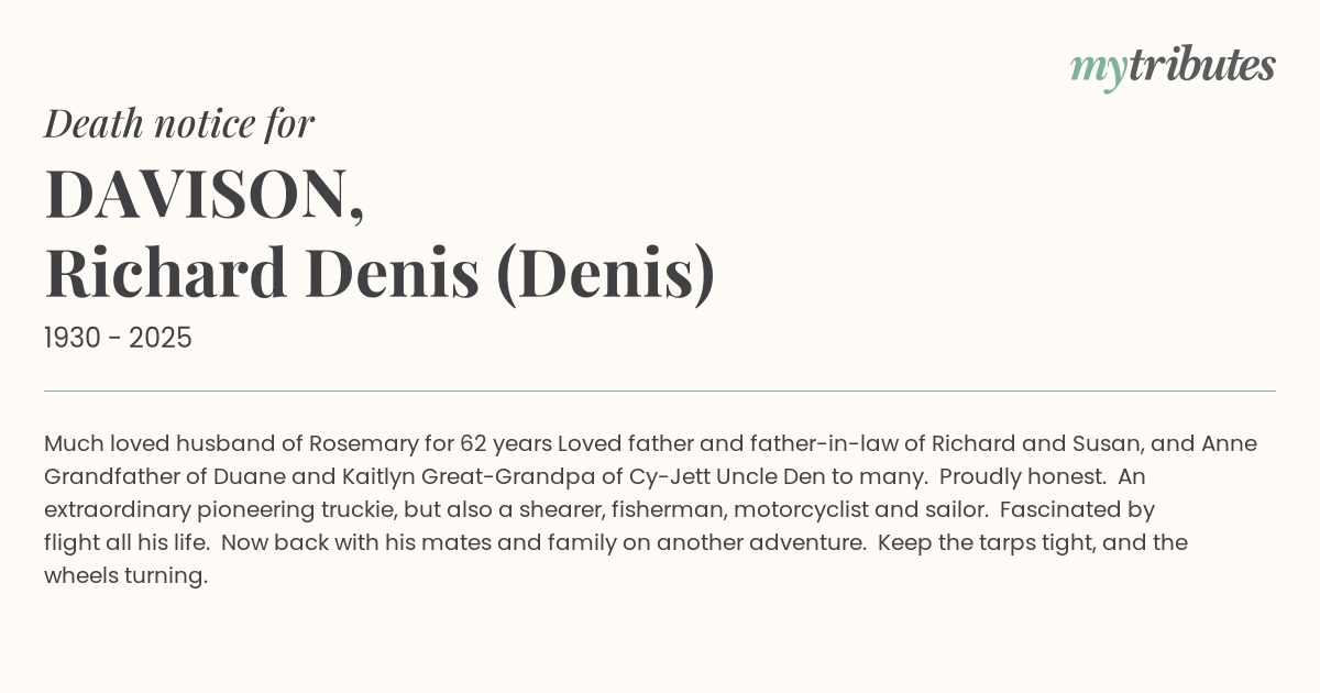 23°CMuch loved husband of Rosemary for 62 years Loved father and father-in-law of Richard and Susan, and Anne Grandfather of Duane and Kaitlyn Great-Grandpa of Cy-Jett Uncle Den to many.