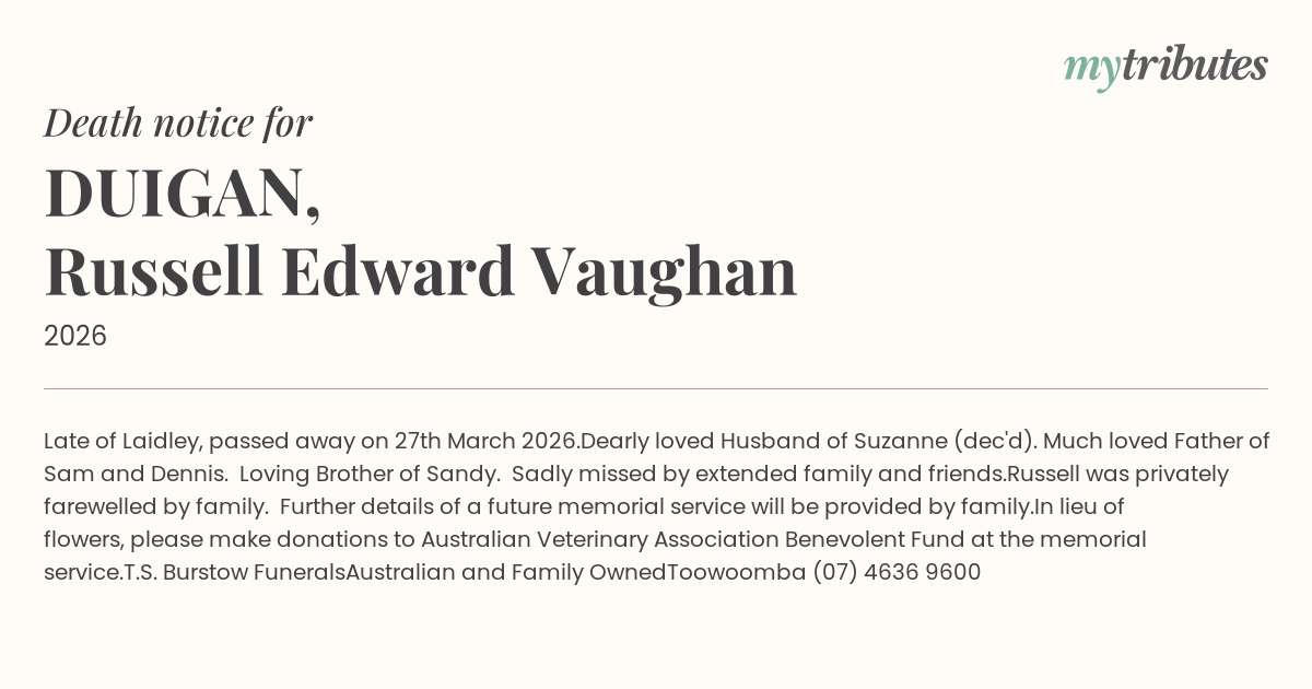 23°CLate of Laidley, passed away on 27th March 2026.