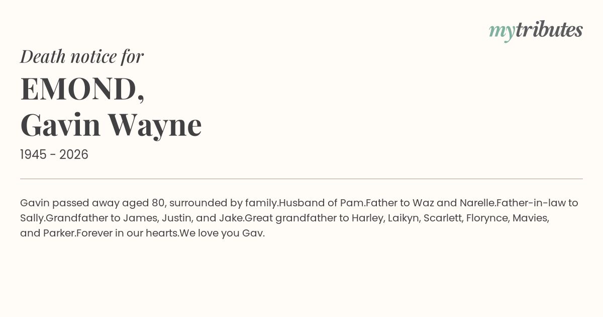 23°CGavin passed away aged 80, surrounded by family.