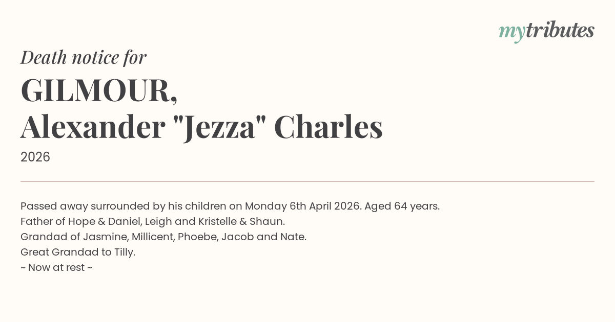 23°CPassed away surrounded by his children on Monday 6th April 2026. Aged 64 years.