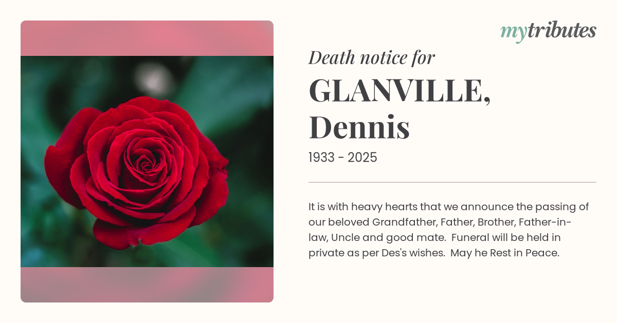 23°CIt is with heavy hearts that we announce the passing of our beloved Grandfather, Father, Brother, Father-in-law, Uncle and good mate. Funeral will be held in private as per Des's wishes. May he Rest in Peace.