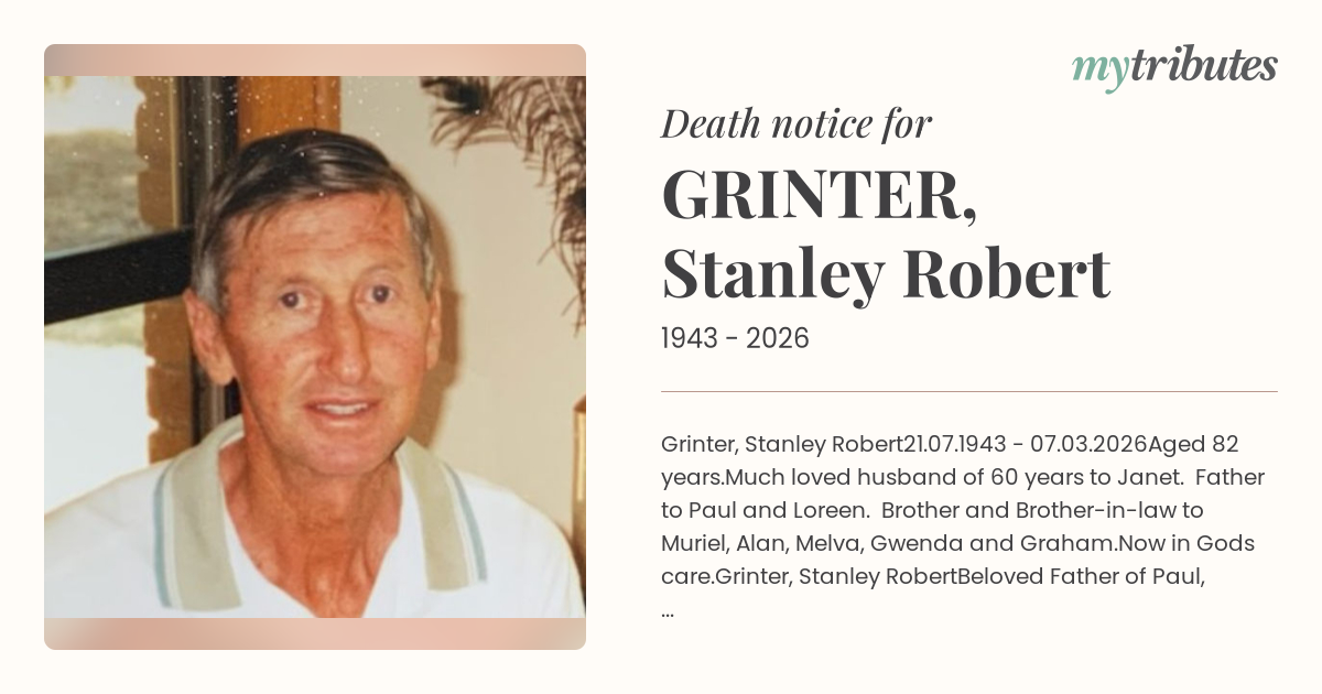 Much loved husband of 60 years to Janet. Father to Paul and Loreen. Brother and Brother-in-law to Muriel, Alan, Melva, Gwenda and Graham.