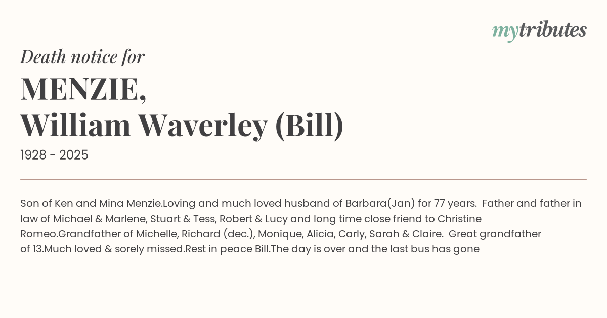 Grandfather of Michelle, Richard (dec.), Monique, Alicia, Carly, Sarah & Claire. Great grandfather of 13.