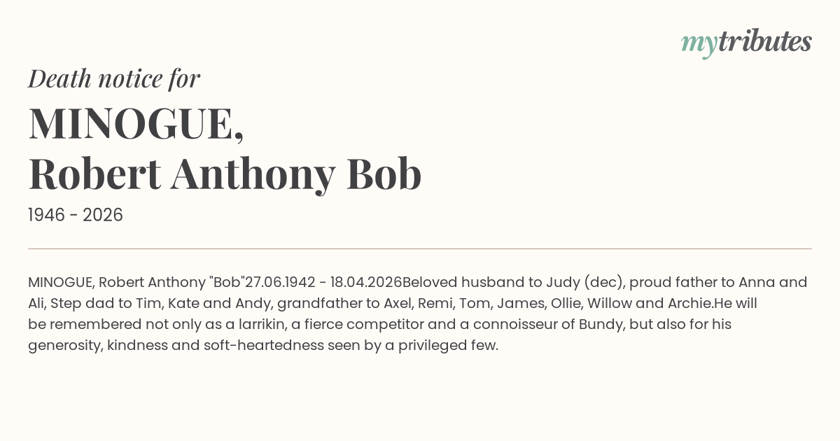 Beloved husband to Judy (dec), proud father to Anna and Ali, Step dad to Tim, Kate and Andy, grandfather to Axel, Remi, Tom, James, Ollie, Willow and Archie.