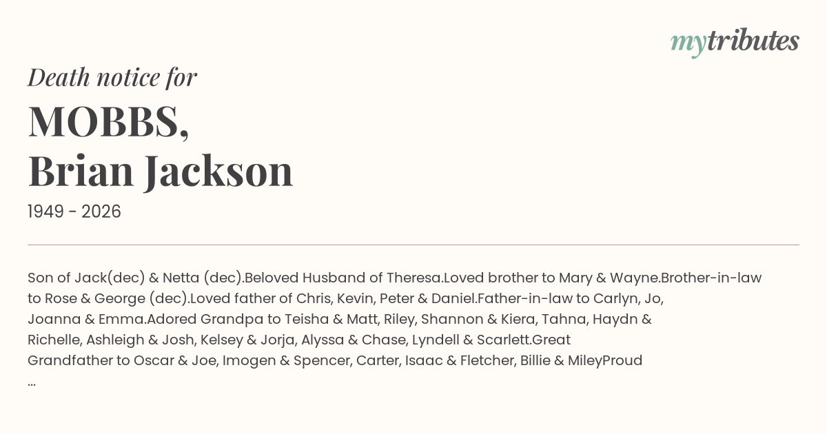 Adored Grandpa to Teisha & Matt, Riley, Shannon & Kiera, Tahna, Haydn & Richelle, Ashleigh & Josh, Kelsey & Jorja, Alyssa & Chase, Lyndell & Scarlett.