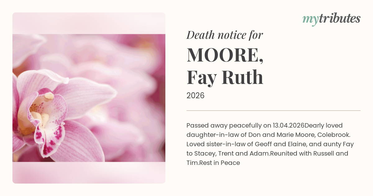 Dearly loved daughter-in-law of Don and Marie Moore, Colebrook. Loved sister-in-law of Geoff and Elaine,