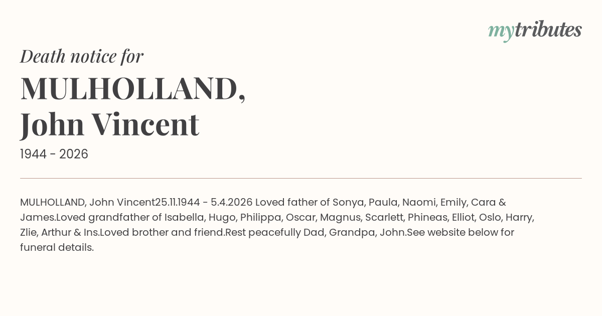 Loved grandfather of Isabella, Hugo, Philippa, Oscar, Magnus, Scarlett, Phineas, Elliot, Oslo, Harry, Zélie, Arthur & Inès.