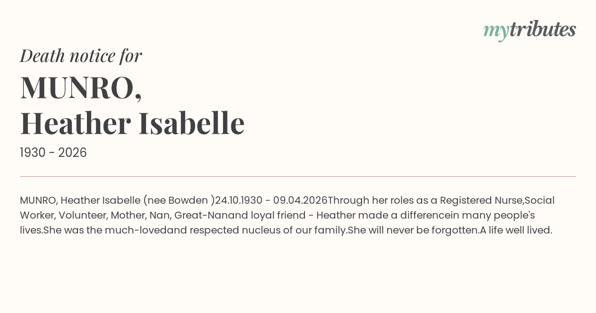 23°CMUNRO, Heather Isabelle (nee Bowden )