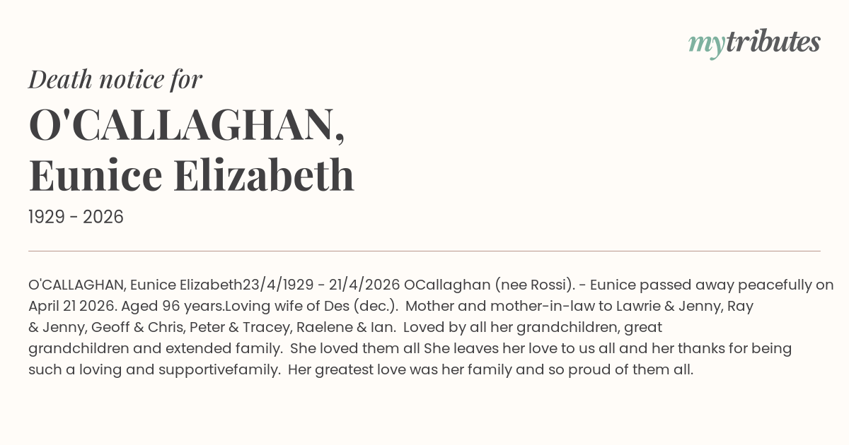 O’Callaghan (nee Rossi). - Eunice passed away peacefully on April 21 2026. Aged 96 years.