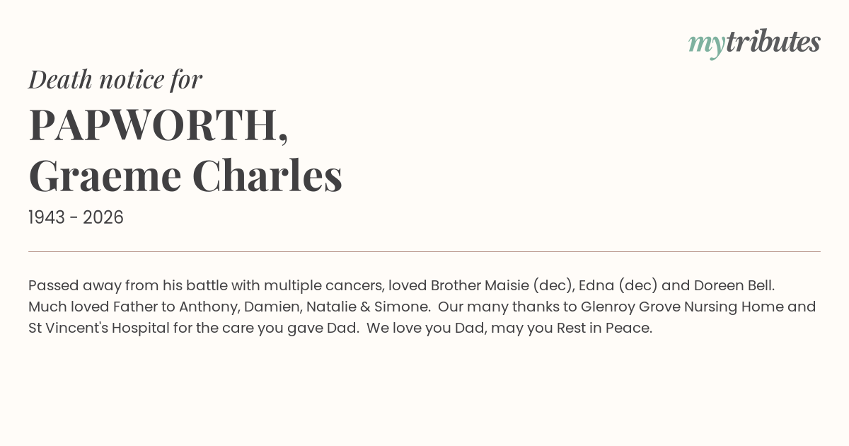 23°CPassed away from his battle with multiple cancers, loved Brother Maisie (dec), Edna (dec) and Doreen Bell. Much loved Father to Anthony, Damien, Natalie & Simone. Our many thanks to Glenroy Grove Nursing Home and St Vincent's Hospital for the care you gave Dad.