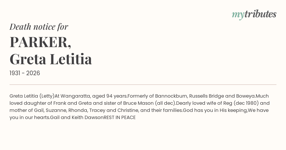 Dearly loved wife of Reg (dec 1980) and mother of Gail, Suzanne, Rhonda, Tracey and Christine, and their families.