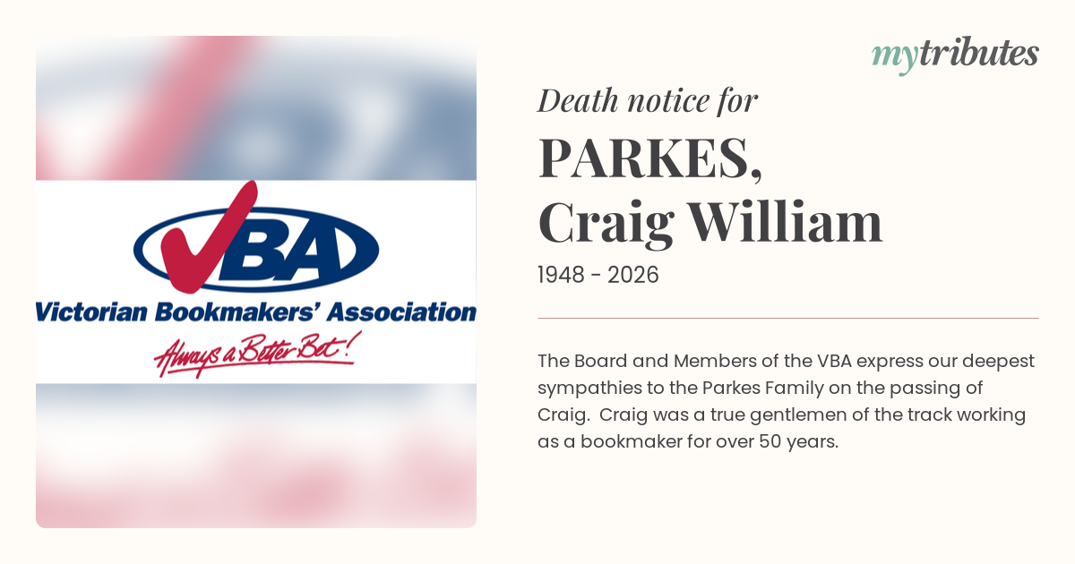 23°CThe Board and Members of the VBA express our deepest sympathies to the Parkes Family on the passing of Craig. Craig was a true gentlemen of the track working as a bookmaker for over 50 years.