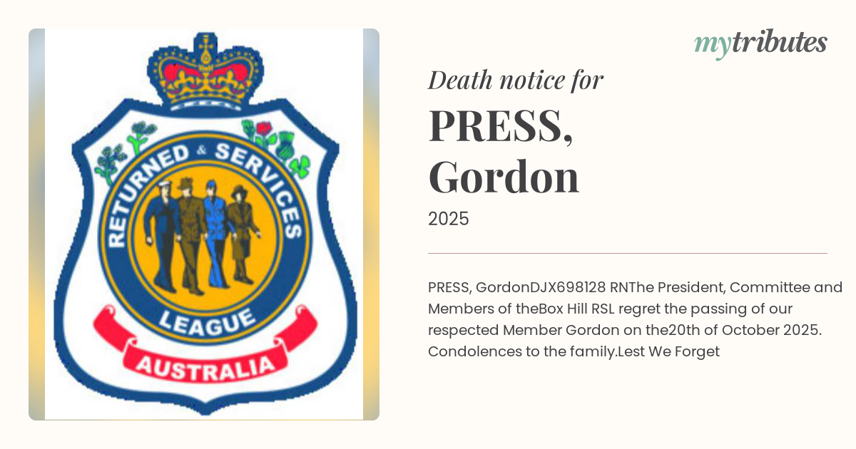 Box Hill RSL regret the passing of our respected Member Gordon on the