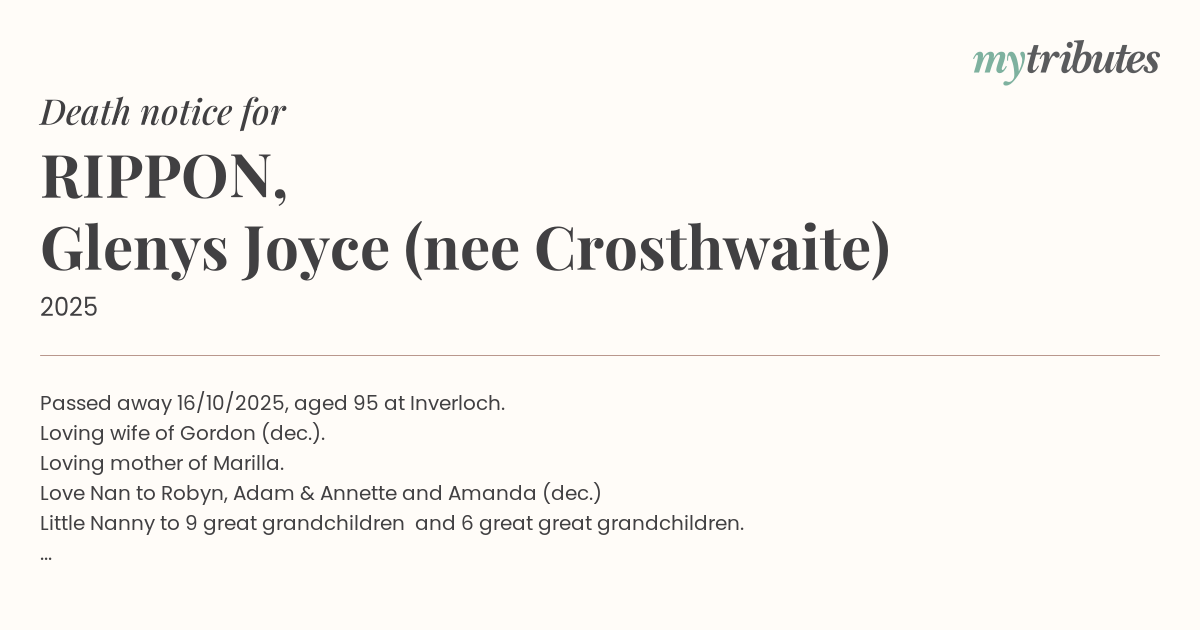 23°CPassed away 16/10/2025, aged 95 at Inverloch.