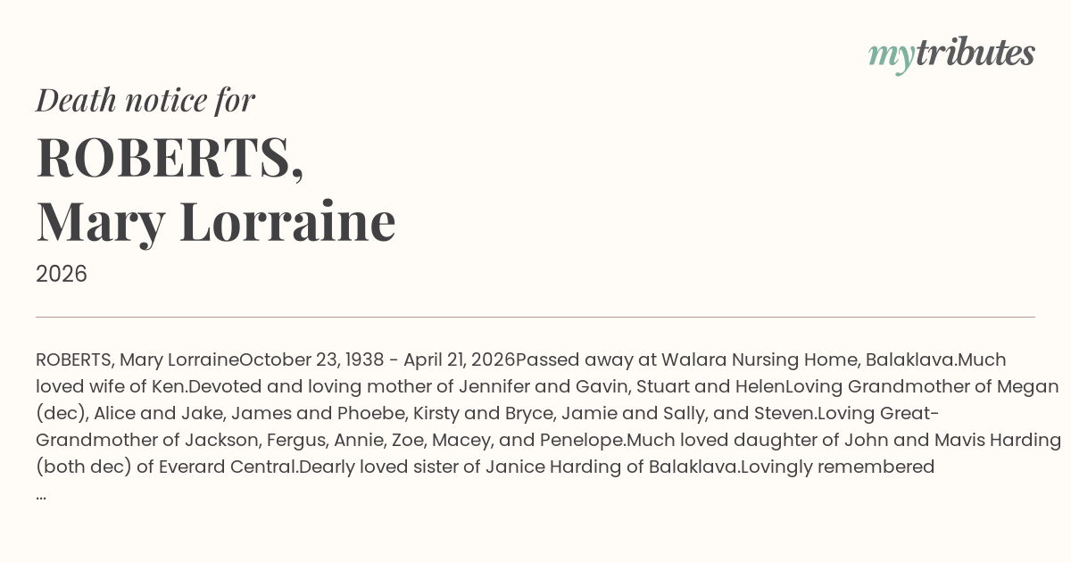 Loving Great-Grandmother of Jackson, Fergus, Annie, Zoe, Macey, and Penelope.