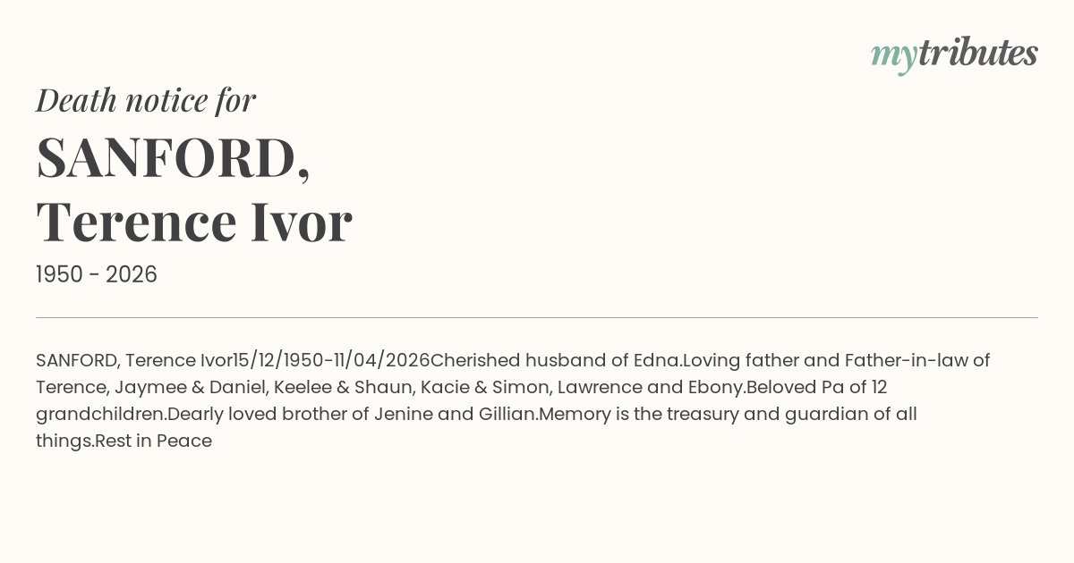 Loving father and Father-in-law of Terence, Jaymee & Daniel, Keelee & Shaun, Kacie & Simon, Lawrence and Ebony.
