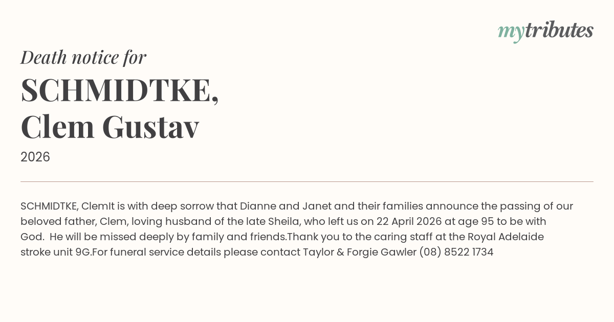 For funeral service details please contact Taylor & Forgie Gawler (08) 8522 1734