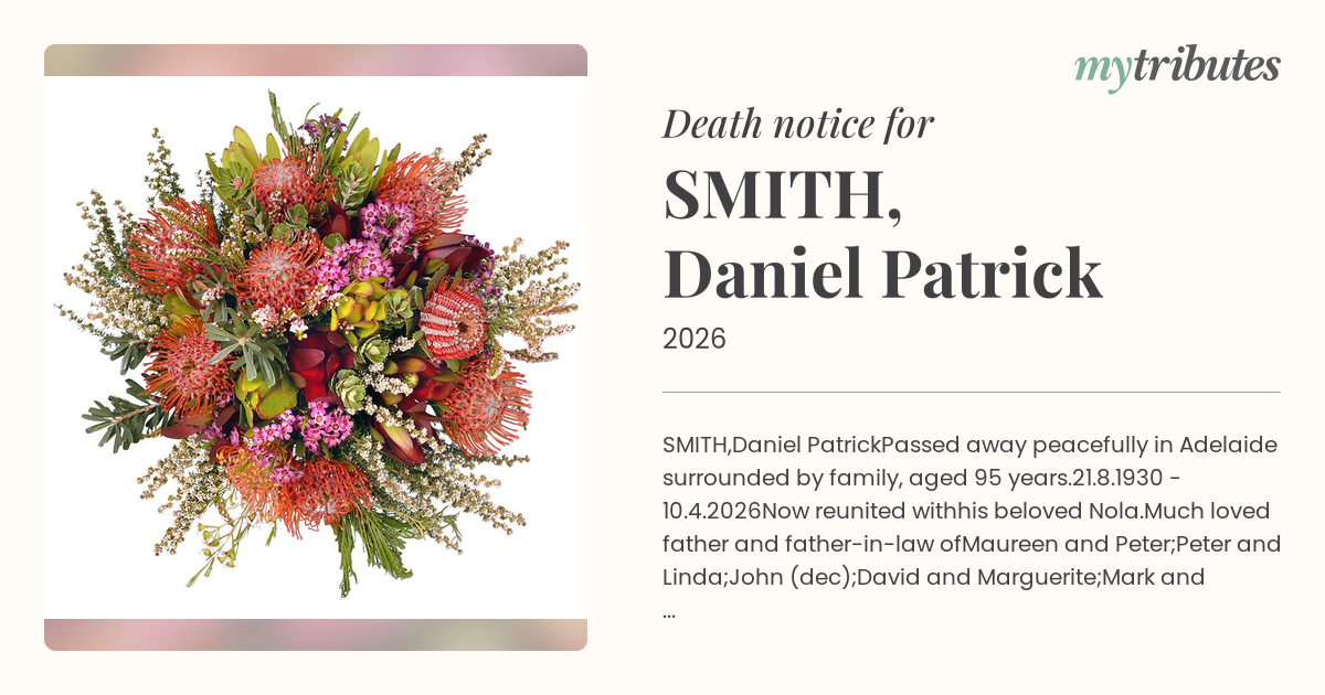 Beloved son of Bill and Ada Smith, of Woolloongabba, and brother and brother-in-law of Des and Margaret; John; Jim (all deceased) and Loreto.
