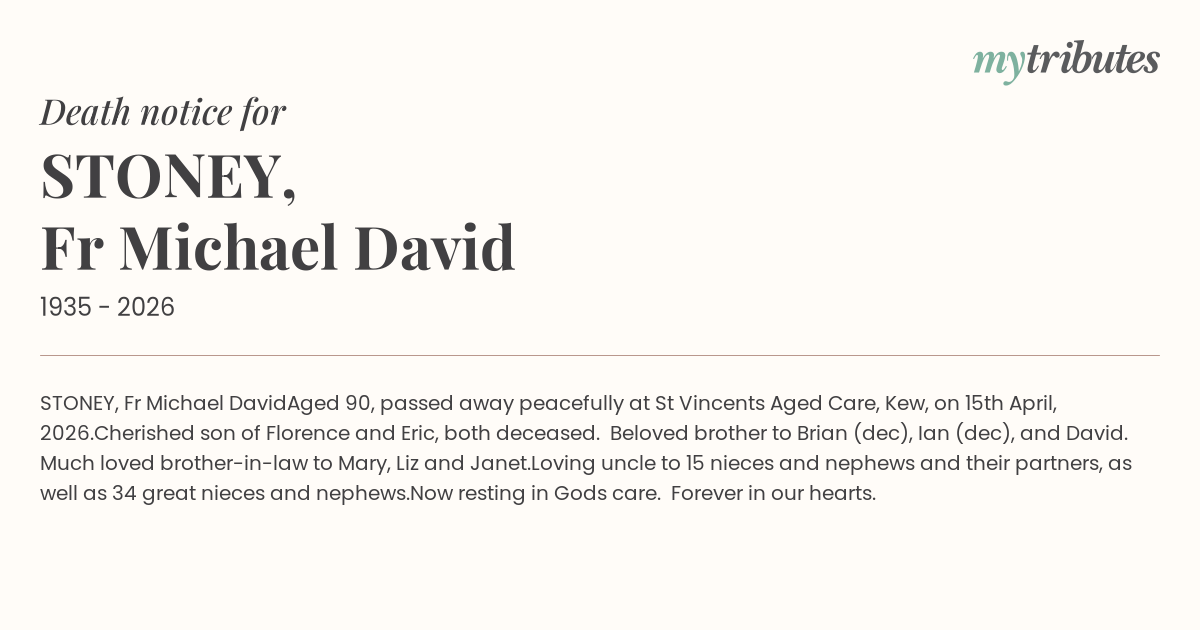 Aged 90, passed away peacefully at St Vincent’s Aged Care, Kew, on 15th April, 2026.