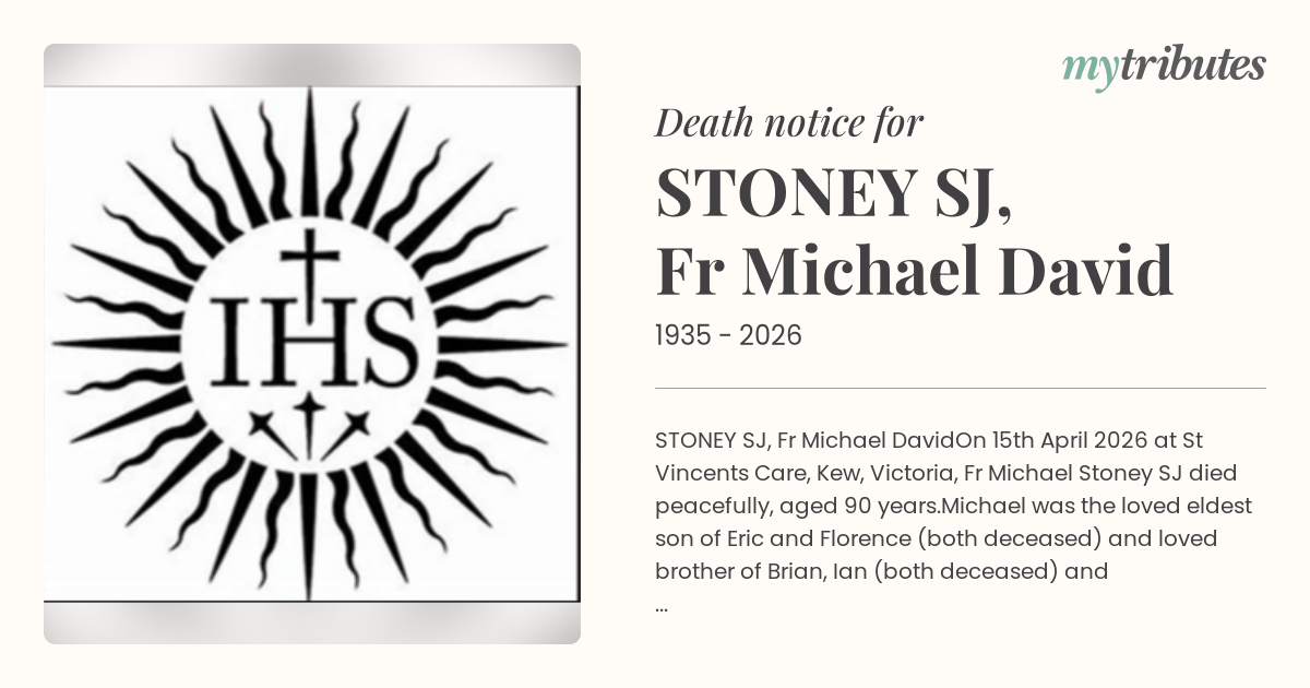 On 15th April 2026 at St Vincent’s Care, Kew, Victoria, Fr Michael Stoney SJ died peacefully, aged 90 years.