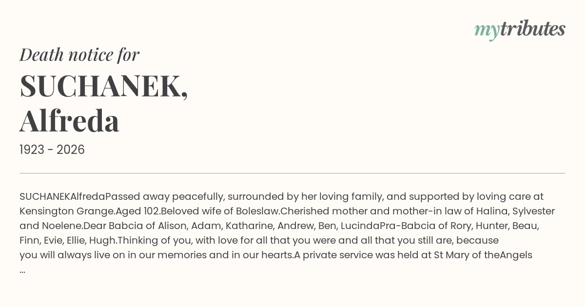 Cherished mother and mother-in law of Halina, Sylvester and Noelene.