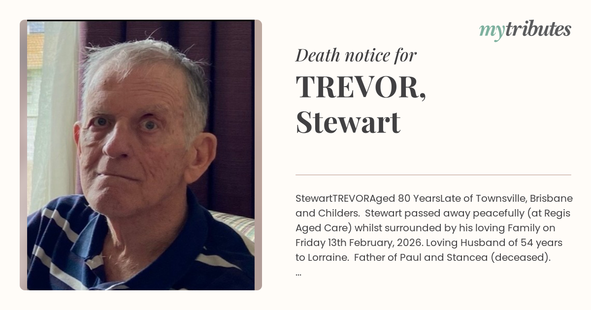 Late of Townsville, Brisbane and Childers. Stewart passed away peacefully (at Regis Aged Care) whilst surrounded by his loving Family on Friday 13th February, 2026. Loving Husband of 54 years to Lorraine. Father of Paul and Stancea (deceased). Grandfather of Toby and Jonah. Brother to Jeffrey, John and Beth. Brother-in-Law to Ross and Uncle to all their respective Families. Loyal Friend to many.