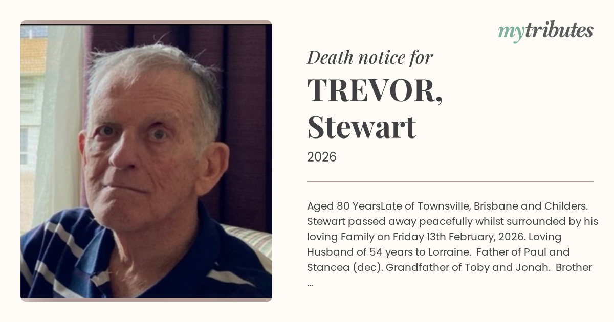 Late of Townsville, Brisbane and Childers. Stewart passed away peacefully whilst surrounded by his loving Family on Friday 13th February, 2026. Loving Husband of 54 years to Lorraine. Father of Paul and Stancea (dec). Grandfather of Toby and Jonah. Brother to Jeffrey, John and Beth. Brother-in-Law to Ross and Uncle to all their respective Families. Loyal Friend to many.