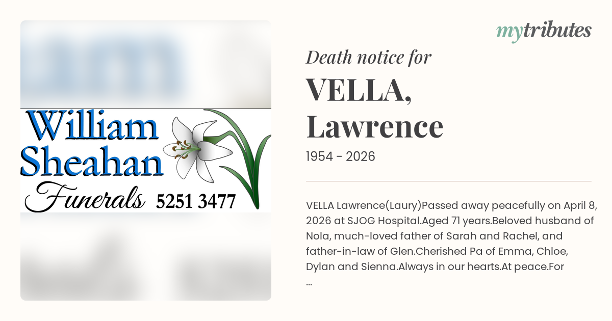 Beloved husband of Nola, much-loved father of Sarah and Rachel, and father-in-law of Glen.