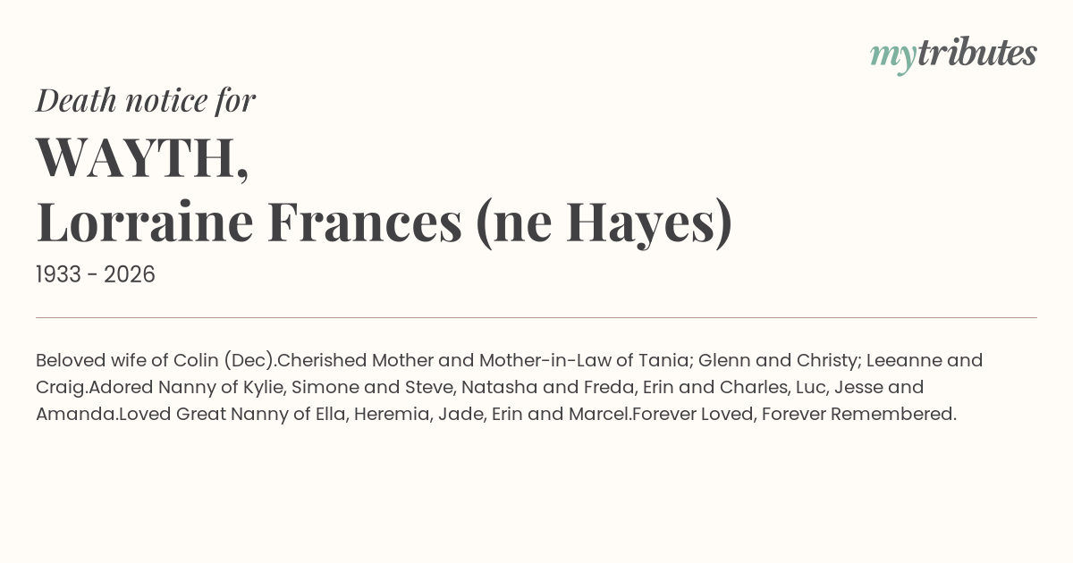 Cherished Mother and Mother-in-Law of Tania; Glenn and Christy; Leeanne and Craig.