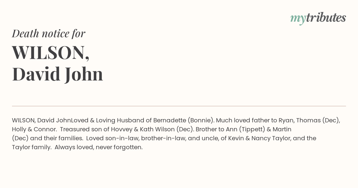 Treasured son of Hovvey & Kath Wilson (Dec). Brother to Ann (Tippett) & Martin (Dec) and their families.