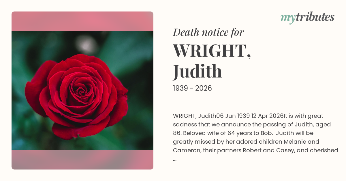 It is with great sadness that we announce the passing of Judith, aged 86. Beloved wife of 64 years to Bob. Judith will be greatly missed by her adored children Melanie and Cameron, their partners Robert and Casey, and cherished grandchildren Claudia, Louis, Eleanor, Georgia, James and Max. In our hearts forever.
