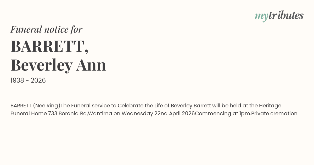 The Funeral service to Celebrate the Life of Beverley Barrett will be held at the Heritage Funeral Home 733 Boronia Rd,