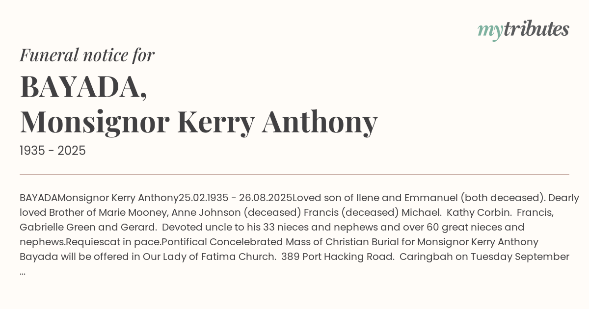 Pontifical Concelebrated Mass of Christian Burial for Monsignor Kerry Anthony Bayada will be offered in Our Lady of Fatima Church. 389 Port Hacking Road. Caringbah on Tuesday September 16. 2025 commencing at 10:30am.
