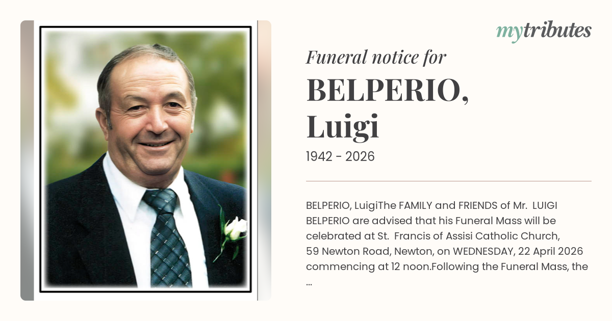 The FAMILY and FRIENDS of Mr. LUIGI BELPERIO are advised that his Funeral Mass will be celebrated at St. Francis of Assisi Catholic Church, 59 Newton Road, Newton, on WEDNESDAY, 22 April 2026 commencing at 12 noon.