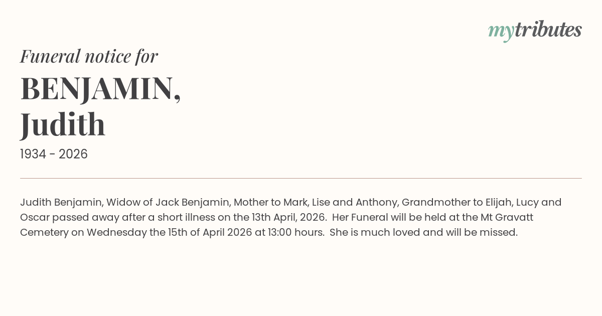 23°CJudith Benjamin, Widow of Jack Benjamin, Mother to Mark, Lise and Anthony, Grandmother to Elijah, Lucy and Oscar passed away after a short illness on the 13th April, 2026. Her Funeral will be held at the Mt Gravatt Cemetery on Wednesday the 15th of April 2026 at 13:00 hours. She is much loved and will be missed.