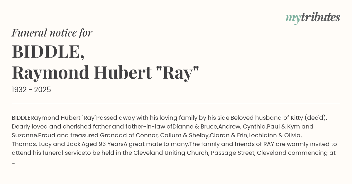 The family and friends of RAY are warmly invited to attend his funeral service