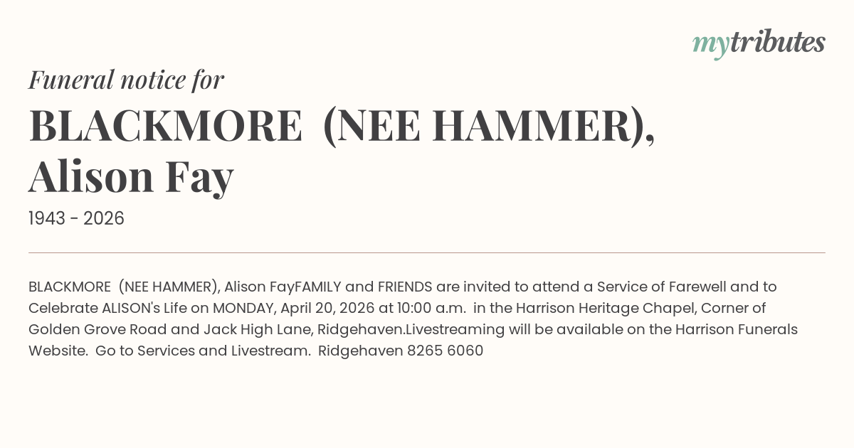 FAMILY and FRIENDS are invited to attend a Service of Farewell and to Celebrate ALISON's Life on MONDAY, April 20, 2026 at 10:00 a.m. in the Harrison Heritage Chapel, Corner of Golden Grove Road and Jack High Lane, Ridgehaven.