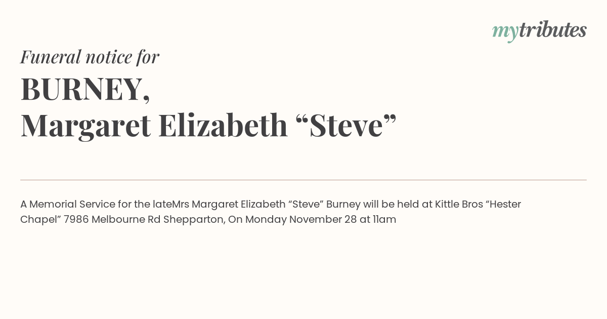 Mrs Margaret Elizabeth “Steve” Burney will be held at Kittle Bros “Hester Chapel” 7986 Melbourne Rd Shepparton, On Monday November 28 at 11am