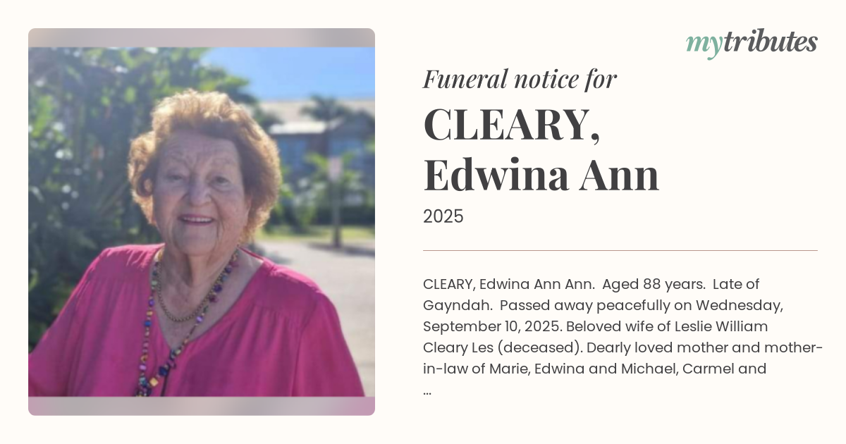 CLEARY, Edwina Ann “Ann”. Aged 88 years. Late of Gayndah. Passed away peacefully on Wednesday, September 10, 2025. Beloved wife of Leslie William Cleary “Les” (deceased). Dearly loved mother and mother-in-law of Marie, Edwina and Michael, Carmel and Grayden, Trisha and Rich, Bernard and Kym, Terry. Loving grandmother of Michael, Ben, Johnathon, Joshua, William, Elizabeth, Johanna, Casey, Jayda and great-grandmother of 5.