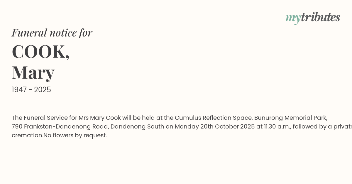 23°CThe Funeral Service for Mrs Mary Cook will be held at the Cumulus Reflection Space, Bunurong Memorial Park, 790 Frankston-Dandenong Road, Dandenong South on Monday 20th October 2025 at 11.30 a.m., followed by a private cremation.