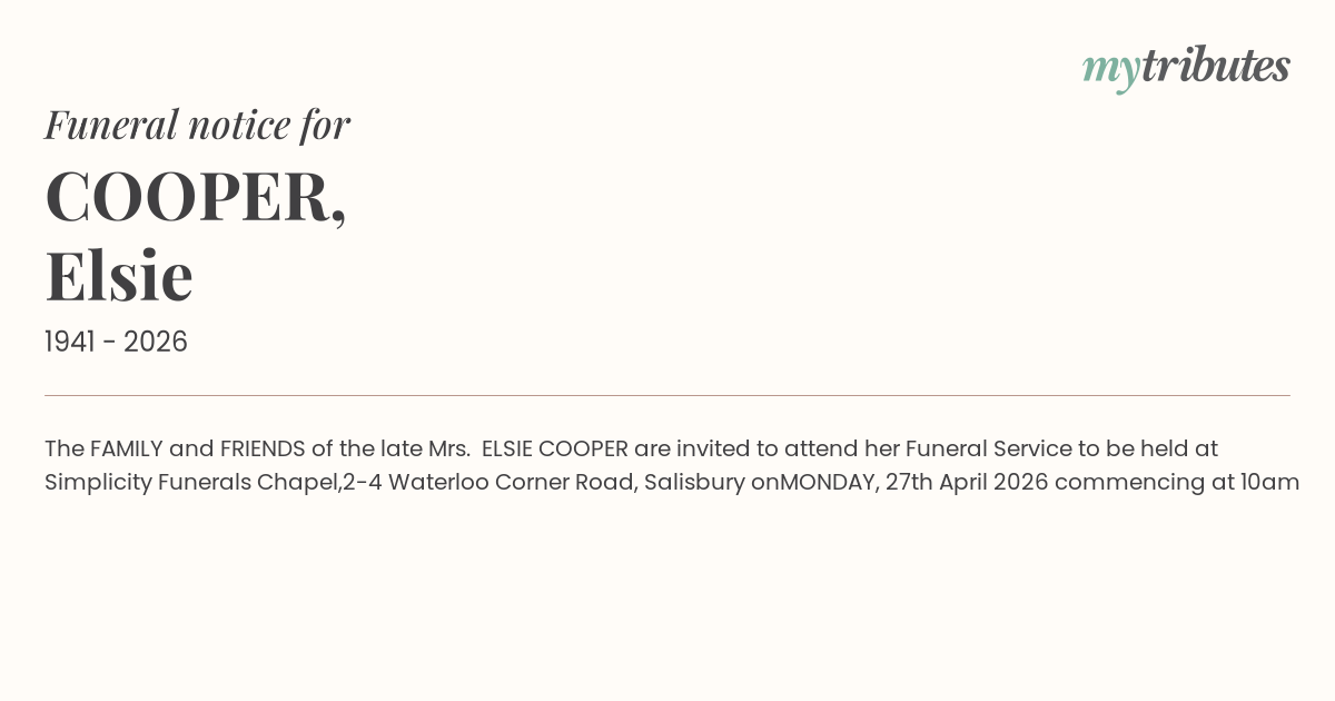 23°CThe FAMILY and FRIENDS of the late Mrs. ELSIE COOPER are invited to attend her Funeral Service to be held at