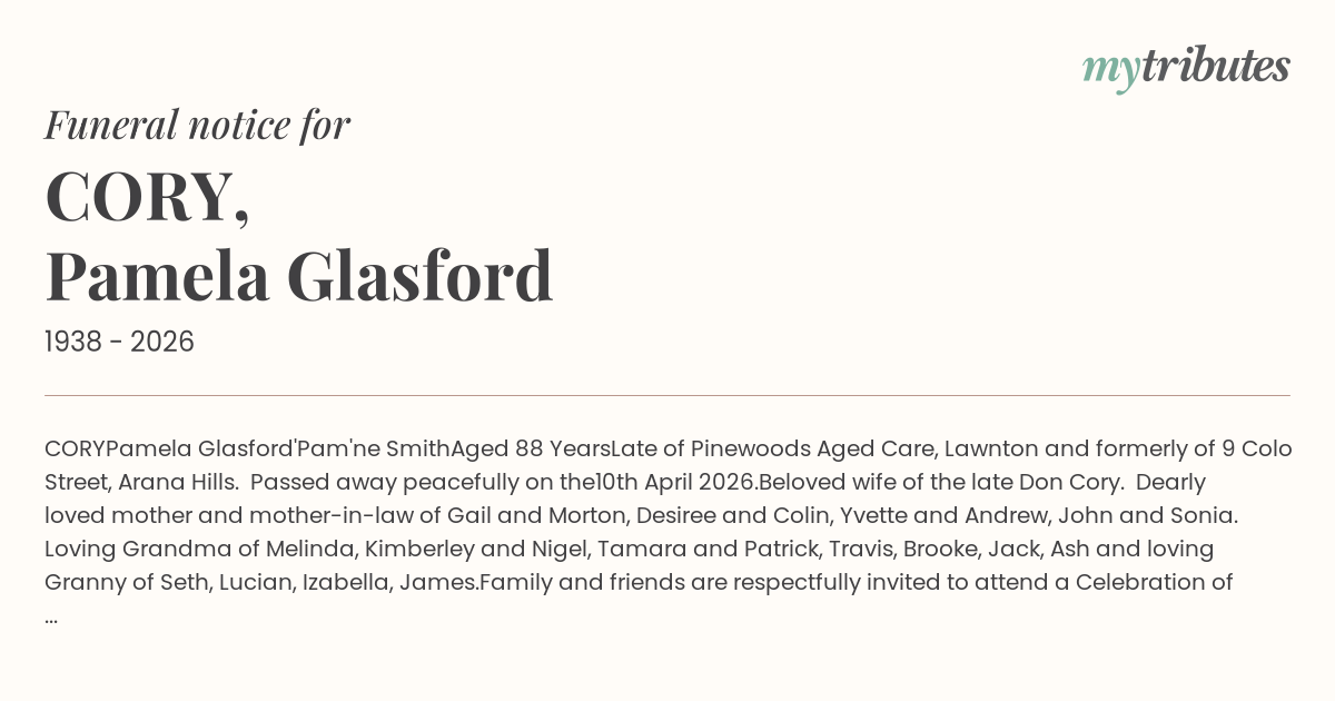 Beloved wife of the late Don Cory. Dearly loved mother and mother-in-law of Gail and Morton, Desiree and Colin, Yvette and Andrew, John and Sonia. Loving Grandma of Melinda, Kimberley and Nigel, Tamara and Patrick, Travis, Brooke, Jack, Ash and loving Granny of Seth, Lucian, Izabella, James.