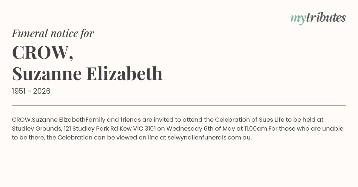 Family and friends are invited to attend the Celebration of Sue’s Life to be held at Studley Grounds, 121 Studley Park Rd Kew VIC 3101 on Wednesday 6th of May at 11.00am.