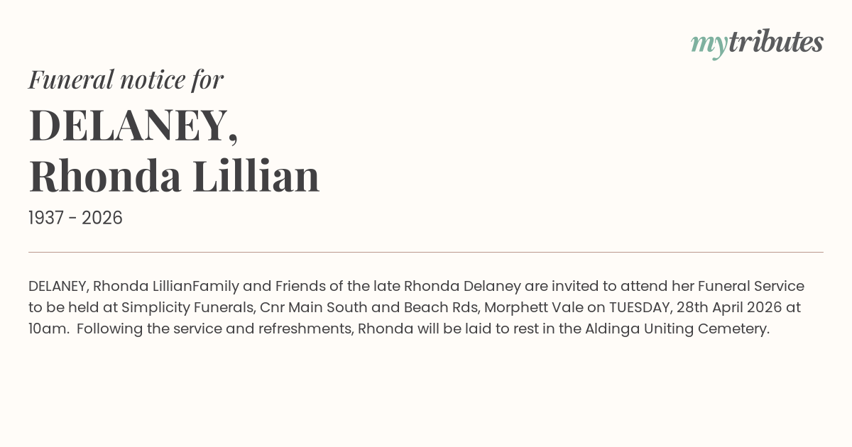 Family and Friends of the late Rhonda Delaney are invited to attend her Funeral Service to be held at Simplicity Funerals, Cnr Main South and Beach Rds, Morphett Vale on TUESDAY, 28th April 2026 at 10am. Following the service and refreshments, Rhonda will be laid to rest in the Aldinga Uniting Cemetery.